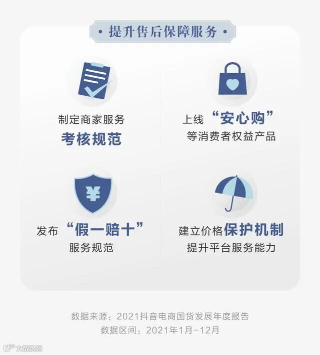 此外,抖音电商还努力提升售后保障服务,通过制定规范引导商家做好售后服务,提升平台服务能力。如上线“安心购”等消费者权益产品;建立价格保护机制;发布《“假一赔十”服务规范》等,保障消费者权益。