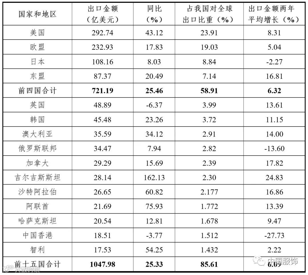 其中,我国对欧盟出口服装额达232.93亿美元,同比增长17.83%,占我国对全球出口比重的19.03%,出口金额两年平均增长5.04%;我国对英国出口服装额达48.89亿美元,同比减少6.37%,占我国对全球出口比重的3.99%,出口金额两年平均增长13.61%;我国对加拿大出口服装额达29.29亿美元,同比增长15.69%,占我国对全球出口比重的2.39%,出口金额两年平均增长17.82%。