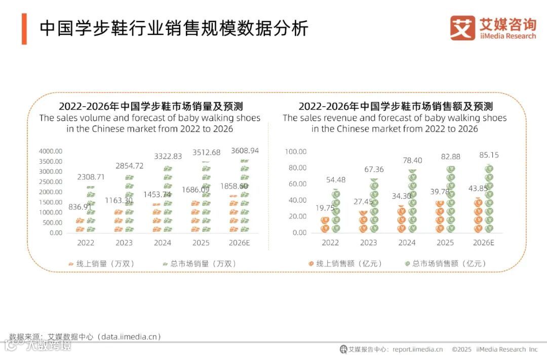 iiMedia Research(艾媒咨询)数据显示,2026年中国学步鞋市场销量预计达到3608.94万双,销售额预计为85.15亿元,市场规模有望持续扩容。伴随科学育儿理念的深度渗透与消费升级趋势的持续推进,学步鞋市场正加速向专业化、精细化方向迭代升级,行业整体呈现出广阔的发展前景。