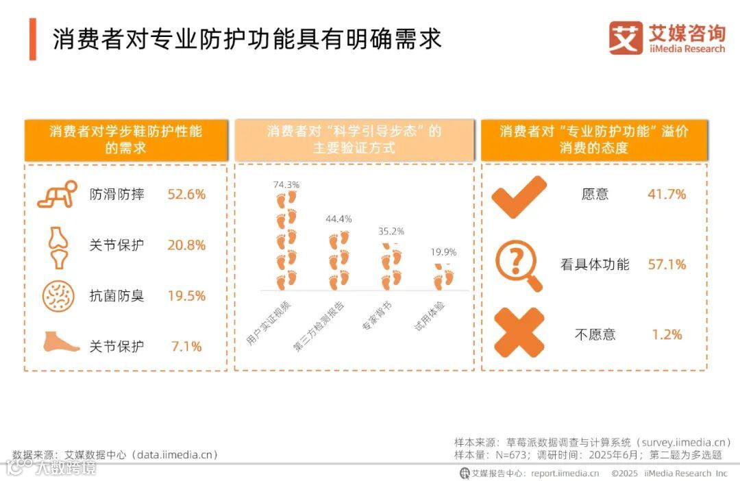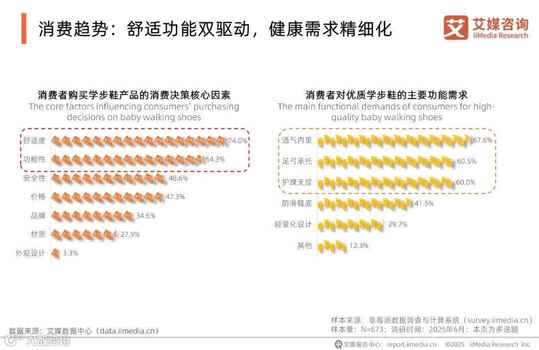 iiMedia Research(艾媒咨询)数据显示,在学步鞋购买决策中,舒适度(74.0%)和功能性(64.3%)构成核心考量维度;在产品功能需求方面,透气内里(67.6%)、足弓承托(60.5%)、护踝支撑(60.0%)成为主要诉求,反映出消费者对产品舒适性与足部健康保护功能的高度重视。