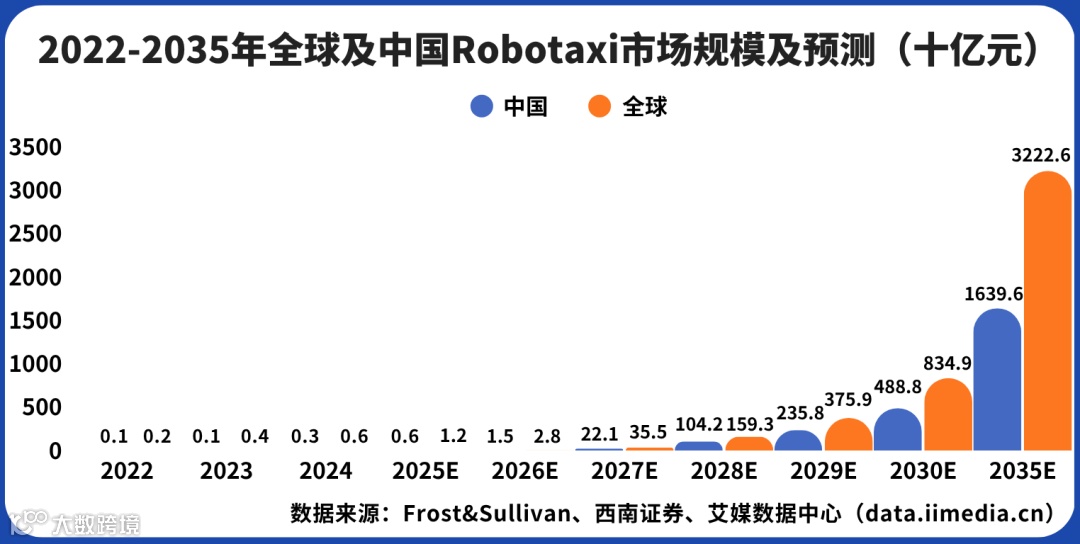 数据显示,2024年中国和全球Robotaxi市场规模仅为3亿元和6亿元,预计2030年将分别达4888亿元、8349亿元,2024-2030年CAGR均超230%;2035年将进一步增至1.6万亿、3.2万亿元。