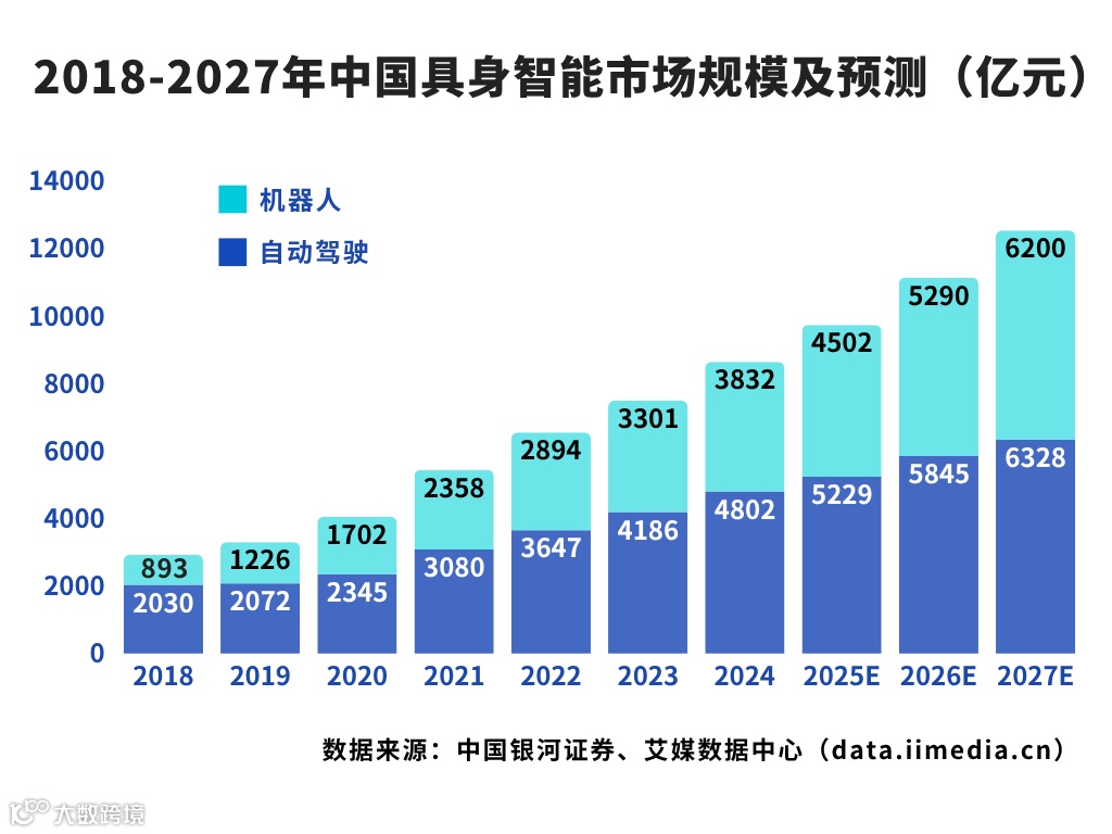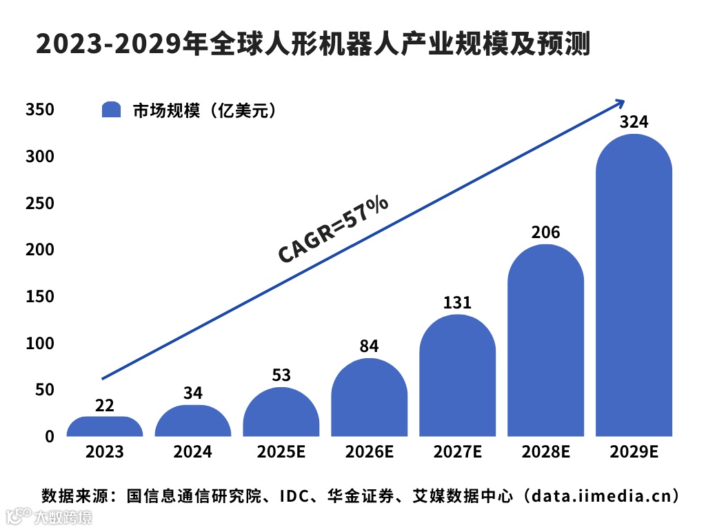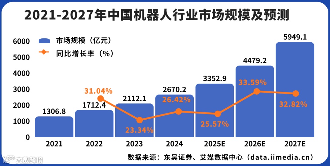 中国市场同样潜力巨大,iiMedia Research(艾媒咨询)数据显示,2021-2027年中国机器人行业市场规模持续攀升,2024年达2670.2亿元,人形机器人年新增市场空间更达2.3万亿元;预计2027年中国机器人行业市场规模将接近6000亿元。