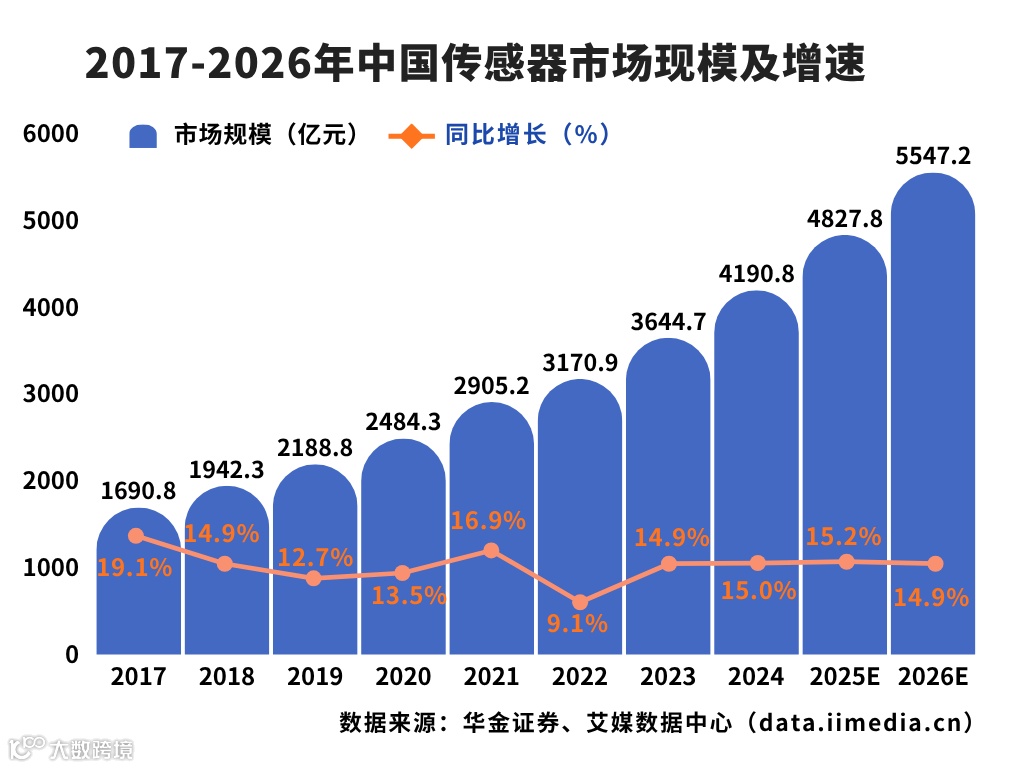 传感器作为具身智能感知物理世界的“核心感官”,在新能源汽车、工业自动化等领域智能化需求攀升带动下,其市场稳步扩容。数据显示,2023年全球传感器市场规模约2269亿美元,预计2034年达5510.3亿美元,复合年增长率8.4%;其中,中国传感器市场规模发展迅速,2024年规模为4190.8亿元、同比增15.0%,预计2026年将达5547.2亿元。