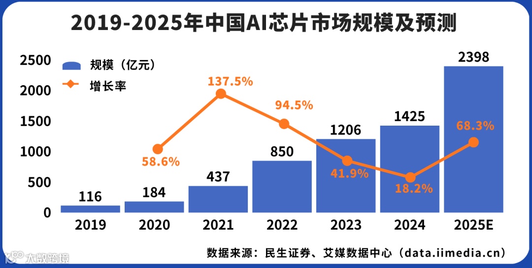 AI芯片是具身智能机器人的核心算力支撑,专门适配其AI计算需求,近年来行业关注度与市场规模同步攀升。数据显示,2024年中国AI芯片市场规模达1425亿元,预计2025年将增至2398亿元,同比增长约68.3%,高速增长态势为具身智能落地筑牢本土基础。