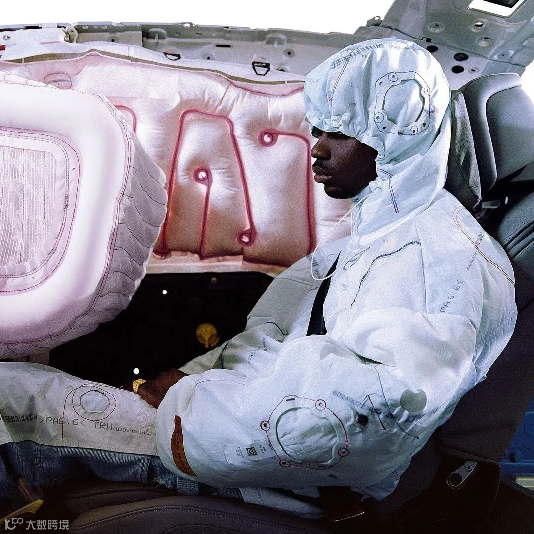 Heron Preston 使用的材料均回收自梅赛德斯奔驰在安全和撞击测试中使用的安全气囊。他设计了三款男女服装和一些独家商品,衣服像安全气囊一样可以充气和放气。