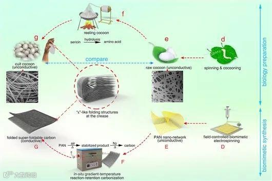 近日,同济大学、上海师范大学及大连理工大学的科研人员,在用化学键理论阐明本征导电材料不能经受大量真折叠原理的基础上,应用超材料设计思想和仿生设计思路,使用改进的静电纺丝/梯度碳化技术,首次仿生制备了一种可承受100万次乃至无限次真折叠而无任何损伤的超折叠导电碳材料(SFCMs)。相关研究成果日前在线发表于《物质》。
