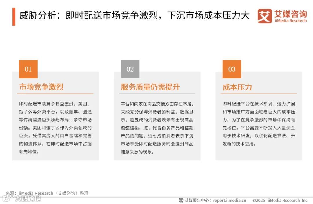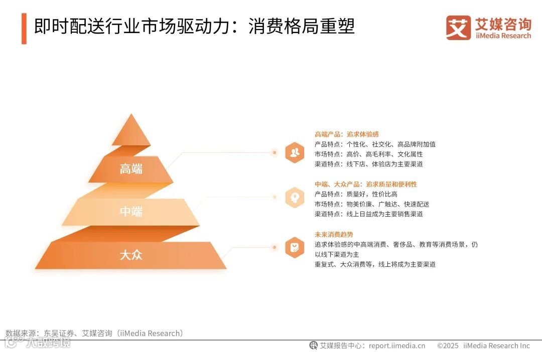 艾媒咨询分析师认为,随着居民收入和消费支出的增长,消费结构逐渐向“品质化+服务化”升级,消费者对即时配送服务的时效性和品牌力提出了更高要求。