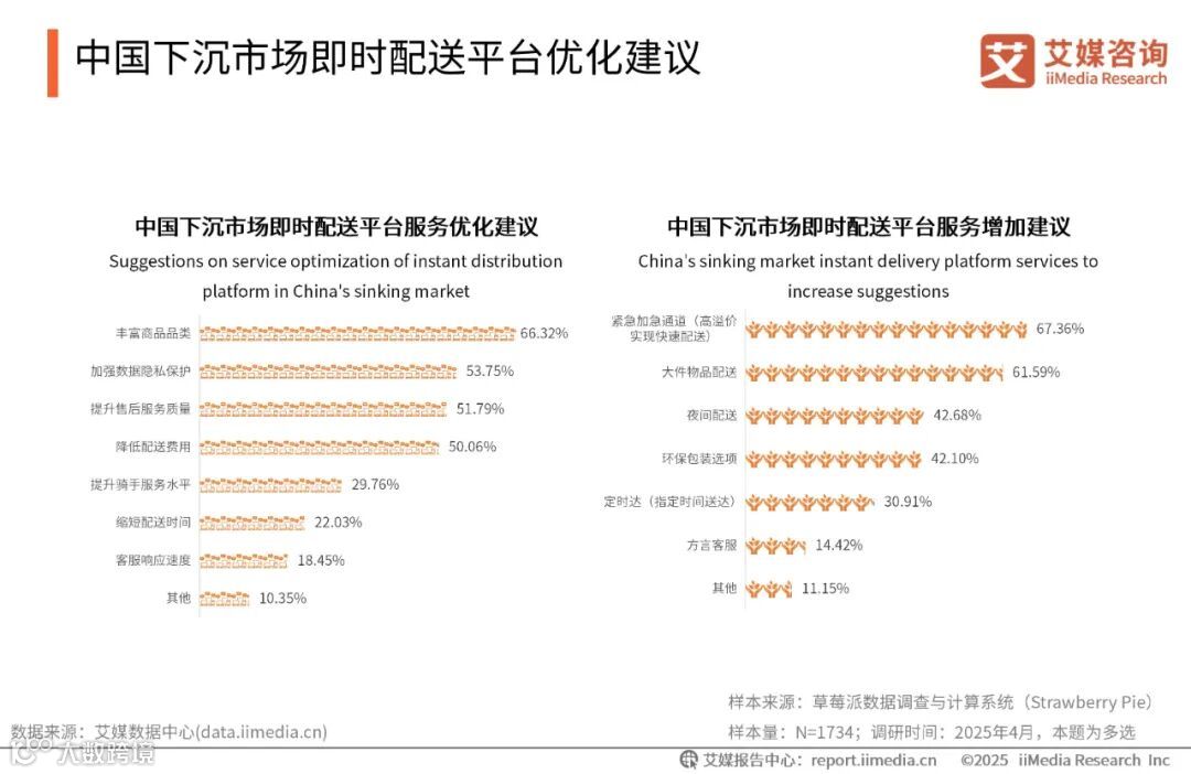 iiMedia Research(艾媒咨询)数据显示,超六成消费者建议下沉市场即时配送平台可以丰富商品的品类,超六成消费者建议增加紧急加急通道、大件物品配送的服务。艾媒咨询分析师认为,随着线上即时消费理念的不断深入,用户对非标准化、个性化即时配送服务的需求持续攀升。紧急加急通道和大件物品配送服务能精准满足用户在特殊场景下的需求,能有效提高用户满意度。