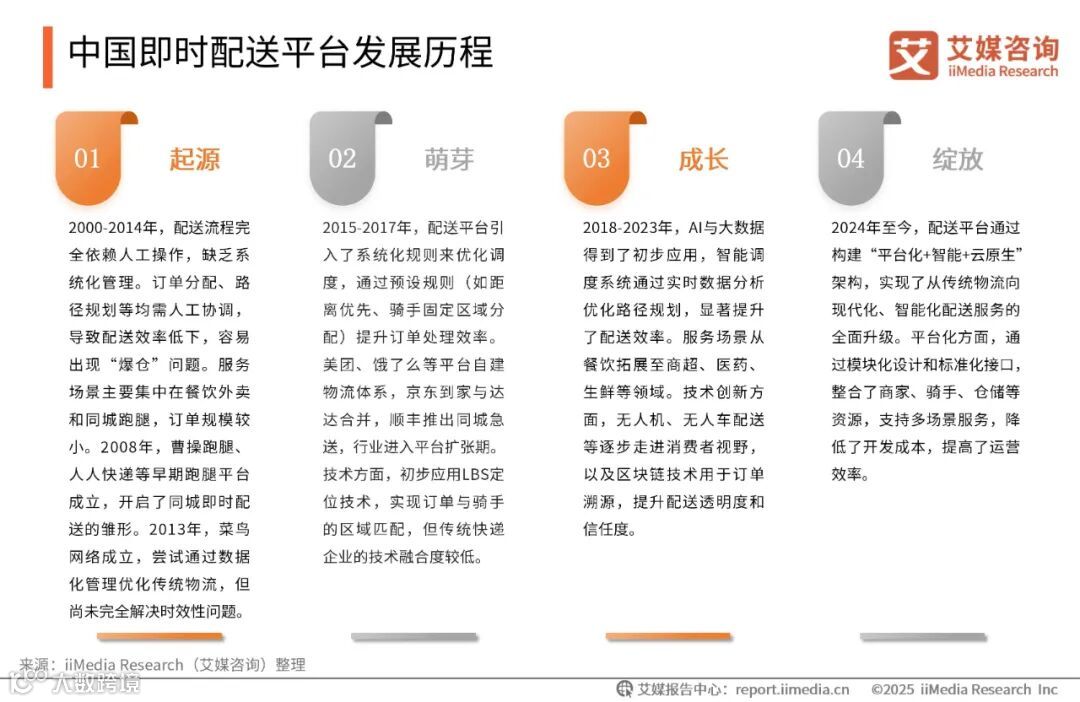 对于下沉市场即时配送平台而言,大数据、人工智能、物联网等技术的应用显著提升了配送效率和服务质量。同时,即时配送行业也在向全场景化与个性化服务方向发展,逐步覆盖更多“微场景”,如夜生活、聚会、旅游、母婴、居家养老等。这不仅推动了品类需求的多元化,也为行业带来了更广阔的发展空间。