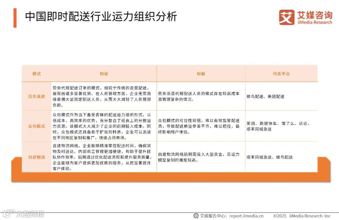 主流配送平台在运力组织上主要有劳务派遣、众包模式和自建物流三种模式。众包模式是其中最轻资产的一种,它能高效整合社会运力,以较低成本实现规模扩张。自建运力模式由平台自行招募员工,虽然在管理和质量提升上更有优势,但前期投入大,规模化运营需要大量时间、物力和人力。劳务派遣模式介于众包和自建运力之间,通过与合作商协作,在控制人力成本的同时保障接单率,以平衡成本与服务质量。
