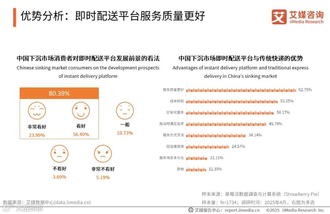 iiMedia Research(艾媒咨询)数据显示,超八成消费者非常看好下沉市场即时配送平台的发展前景,其中超六成消费者认为即时配送平台相比于传统快递服务质量更好。艾媒咨询分析师认为,即时配送平台凭借其更贴近用户需求的服务模式、更高效的配送效率,以及更低的运输成本,赢得了消费者的认可和青睐。