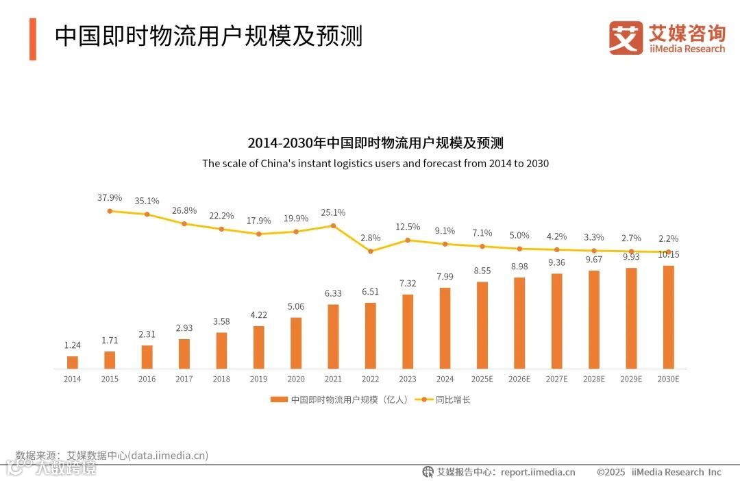 下沉市场,涵盖三四线城市及以下的县镇与农村地区,是我国人口基数最大、面积最大、潜力最大的市场。在消费升级与数字化转型的双重作用下,市场进一步拓展了即时配送服务的应用场景,使之成为推动下沉市场消费活力与经济潜力释放的重要力量。各大即时配送平台纷纷布局下沉市场,即时配送服务逐渐成为下沉市场居民生活不可或缺的部分。全球新经济产业第三方数据挖掘和分析机构iiMedia Research(艾媒咨询)最新发布的《2025-2026年中国下沉市场即时配送平台趋势洞察报告》数据显示2024年中国即时物流用户规模达7.99亿人,同比增长9.1%,未来随着即时物流的持续扩展,2030年用户规模预计将超10亿人。