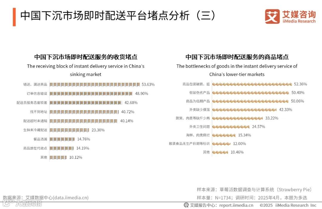 iiMedia Research(艾媒咨询)数据显示,在商品方面,超五成的消费者表示有出现商品包装破损、脏,假冒伪劣产品和临期产品的问题。艾媒咨询分析师认为,目前中国下沉市场即时配送平台存在配送网络与运力不足、信息管理与订单处理复杂,以及监管力度不足的情况。平台和商家在商品交接方面存在不足,未能充分保障消费者的利益。