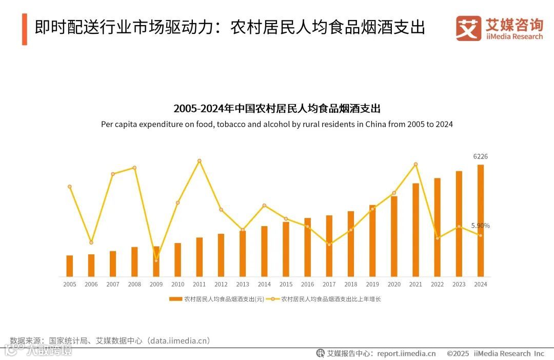 数据显示,中国农村居民人均食品烟酒支出整体呈现上升趋势,2024年中国农村居民人均食品烟酒支出达6226元,同比增长5.90%。随着农村居民生活水平的逐步提升及消费结构的优化,农村居民在满足基本生活需求的基础上,更加注重食品的品质和多样性,对食品等消费品的需求也有所上升。农村消费市场的潜力不断释放,为即时配送平台等相关配套行业的发展提供了广阔的空间。