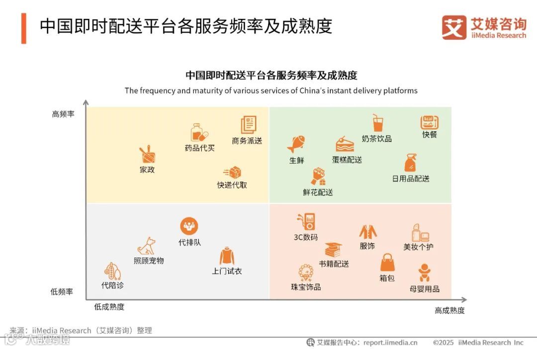 中国即时配送平台的外卖服务因其高频率和成熟度在市场中占据主导地位,而部分新兴服务则因成熟度较低和使用频率较少,仍需进一步发展和培养市场。