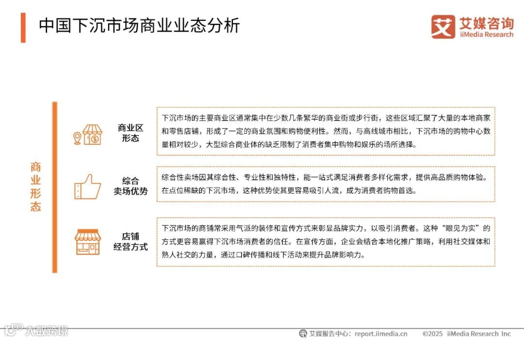 在下沉市场中,商圈数量和人均商业面积相较于高线市场较低,商业活动主要集中在某些特定区域。这些区域通常以商业街和步行街的形式存在,汇聚了大量的本地商家和零售店铺,形成了独特的商业氛围。然而,功能更为全面的大型购物中心在下沉市场中相对较少,这意味着消费者在购物时的选择相对有限,更多地依赖于传统的商业街形式。