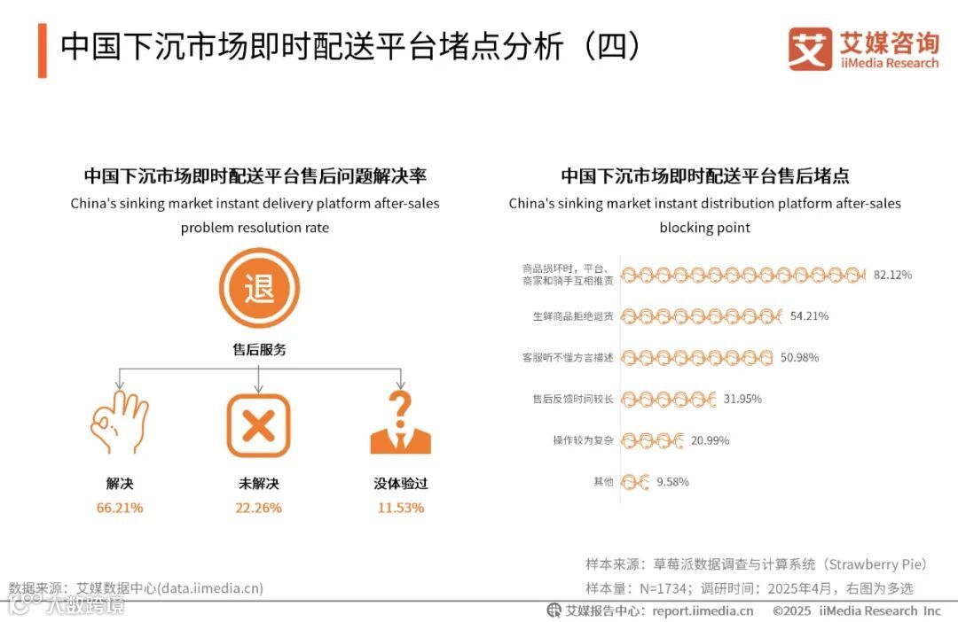 iiMedia Research(艾媒咨询)数据显示,近七成消费者表示下沉市场享受即时配送服务时会遇到商品随意丢放,缺乏精准送达和缺乏标准地址门牌,骑手需反复确认的堵点,影响即时配送的服务体验。超六成的消费者表示在下沉市场中非常需要乡镇自提点。艾媒咨询分析师认为,在偏远的乡村地区,道路标识的不精准使得配送人员在寻找目的地时经常遇到困难。这种现象对下沉市场即时配送行业的发展造成了一定的阻碍。