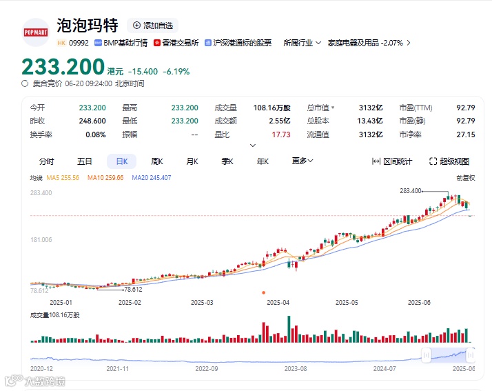 然而,泡泡玛特的股价走势出现反转。前期市值暴增的神话尚未褪色,6月19日,受LABUBU系列大量补货、二手成交价下滑等消息影响,泡泡玛特股价下跌5.33%,最新市值为3338.56亿港元,较最高点时期跌去超240亿港元,这与前期股价的持续飙升形成强烈对比。