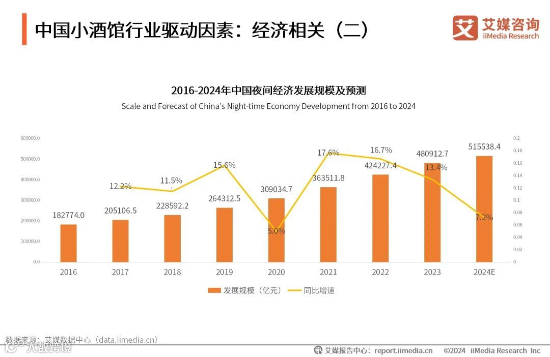 iiMedia Research(艾媒咨询)数据显示,2023年中国夜间经济发展规模约48万亿元,预计2024年有望突破51万亿元。艾媒咨询分析师认为,为了刺激消费,中国各地政府对夜间经济的扶持力度加大,中国夜间经济发展规模持续增长,为小酒馆这类以夜间经营为主的新消费业态带来了巨大的发展潜力。