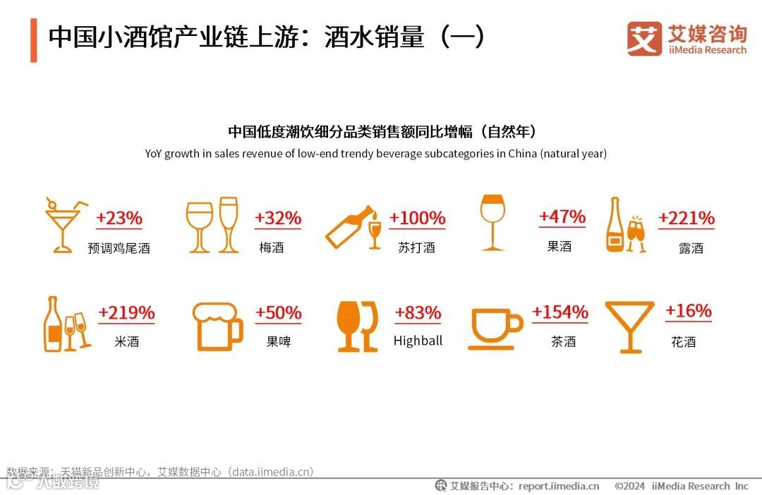 随着消费群体对饮酒观念的转变,国内低度潮饮酒市场未来将持续高速发展。天猫新品创新中心(TMIC)发布的《2022低度潮饮趋势报告》显示,从电商表现来看,低度潮饮酒各品类电商规模稳步增长。低度酒的流行为小酒馆行业带来了新的发展机遇,低度酒的较低酒精含量和可能的成本优势,为小酒馆提供了更大的价格策略灵活性和创新空间。