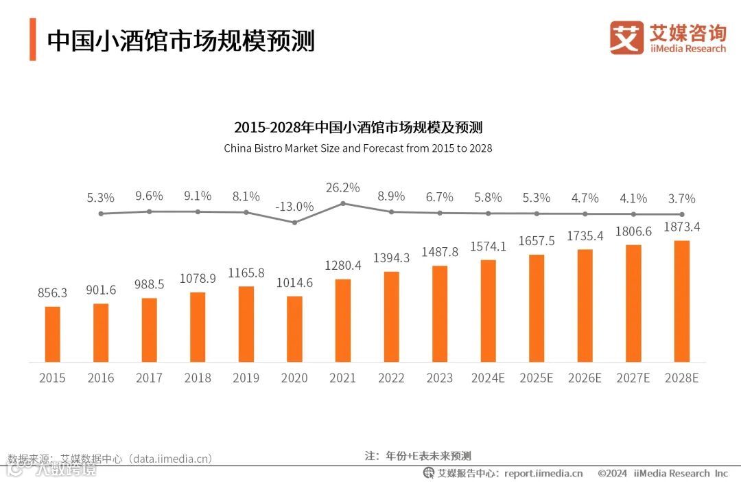 iiMedia Research(艾媒咨询)数据显示,2023年中国小酒馆行业市场为1487.8亿元,同比上升6.7%;预计2027年将突破1800亿元。艾媒咨询分析师认为,小酒馆作为夜间经济的组成部分,满足了年轻消费者对于社交和夜生活的需求,具备持续发展的潜力。目前,中国小酒馆市场集中度较低,行业标准化和供应链能力相对较弱,构建品牌特色和差异化优势,成为行业未来发展的关键挑战。