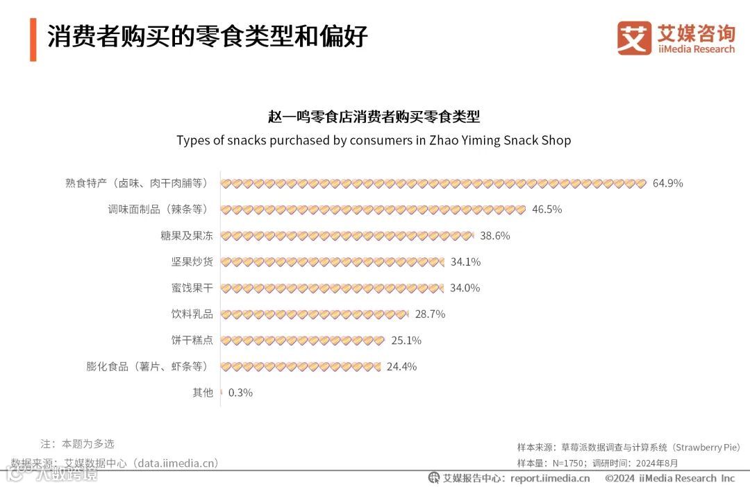 iiMedia Research(艾媒咨询)调研数据显示,商品品质好(56.6%)和商品种类多(49.2%)是消费者选择赵一鸣零食的主要原因;赵一鸣零食店的消费者在购买零食时展现出多样化的偏好,熟食特产以64.9%的购买率位居榜首,其次是调味面制品(46.5%);此外,消费者指出赵一鸣零食店存在店内知名品牌零食较少(60.8%)和店面分布过于集中(59.4%)的问题。