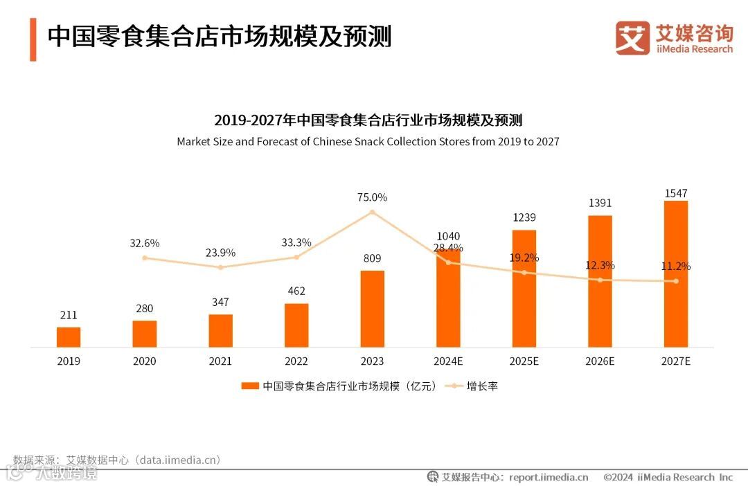 iiMedia Research(艾媒咨询)数据显示,2023年中国零食集合店市场规模为809亿元,预计2027年有望达到1547亿元。得益于政策支持和近场业态流量提升,零食集合店迎来低成本扩张的黄金机遇,当前已形成区域品牌群雄并立的格局。其中,赵一鸣零食成为高知名度品牌,截至2024年6月,赵一鸣零食店门店数量已超过6000家。