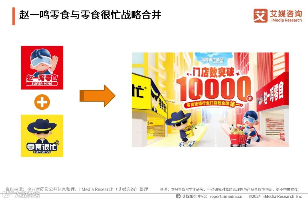 iiMedia Research(艾媒咨询)数据显示,中国零食集合店扩张迅猛,其中,鸣鸣很忙集团旗下赵一鸣零食、零食很忙全国门店数均已突破 6000 家。2024年赵一鸣零食和零食很忙合并成立鸣鸣很忙集团,合并后双品牌门店数量总和突破1万家。当前已经形成江西赵一鸣、湖南零食很忙和川渝贵零食有鸣等区域品牌群雄并立的格局。