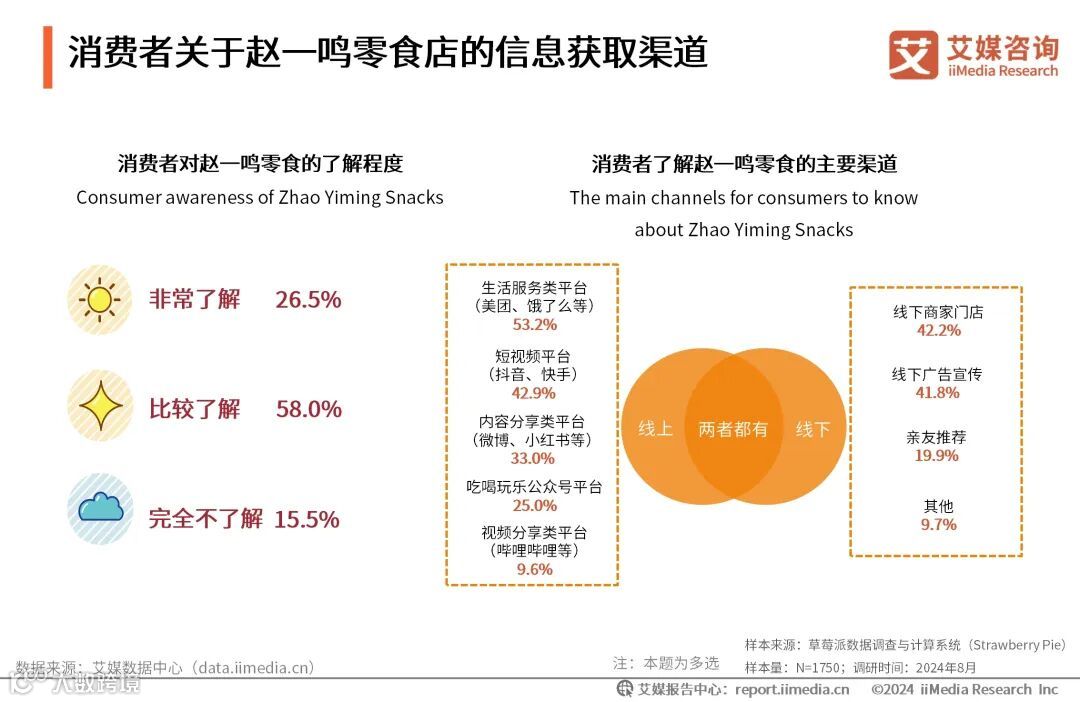 iiMedia Research(艾媒咨询)数据显示,84.5%的消费者对赵一鸣零食店有着不同程度的了解。其中,通过美团、饿了么等生活类平台了解到赵一鸣零食店的消费者占53.2%;在抖音、快手等短视频平台了解的消费者占42.9%;直接在线下零食集合店门店了解的消费者占42.2%。
