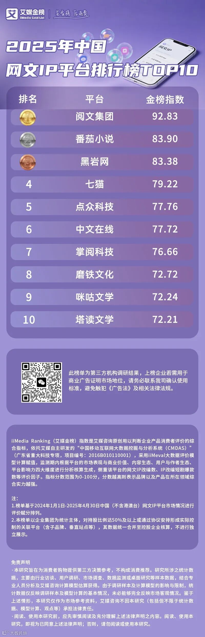 iiMedia Ranking(艾媒金榜)是艾媒咨询旗下中国新消费品牌评价机构,为消费者提供客观的品牌信息及购物消费指南。基于2024年1月1日—2025年4月30日的数据调研与行业访谈,iiMedia Ranking(艾媒金榜)最新发布《2025年中国网文IP平台排行榜TOP10》。榜单根据iiMeval大数据评价模型计算赋值,从“市场表现与商业价值”“内容生态”“用户与作者生态”“平台影响力”四大维度共八个指标对中国网文IP平台进行综合评估。