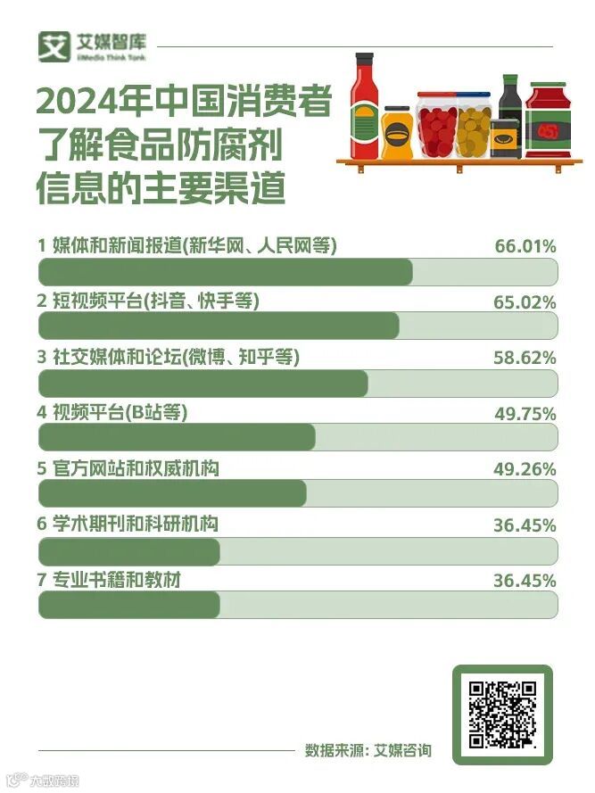 iiMedia Research(艾媒咨询)调研数据显示,消费者对食品防腐剂了解程度较高(74.08%的消费者表示了解),新华网、人民网等媒体和新闻报道,抖音、快手等短视频平台以及微博、知乎等社交媒体和论坛是消费者对食品防腐剂的主要了解渠道。