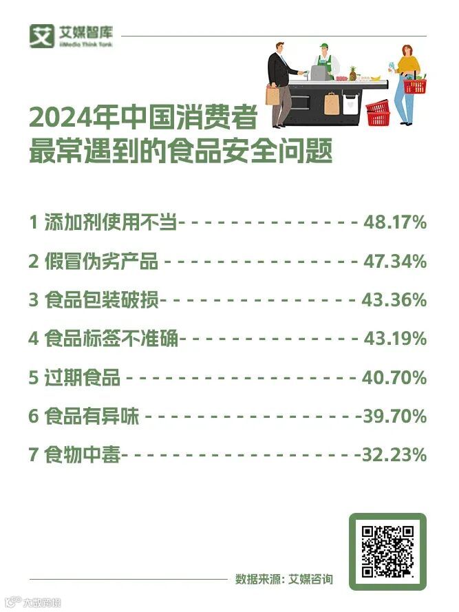 在当前的消费市场中,食品安全问题一直是公众关注的焦点。iiMedia Research(艾媒咨询)调研数据显示,添加剂使用不当(48.17%)、假冒伪劣产品(47.34%)、食品包装破损(43.36%)、食品标签不准确(43.19%)等是消费者最常遇到的食品安全问题。