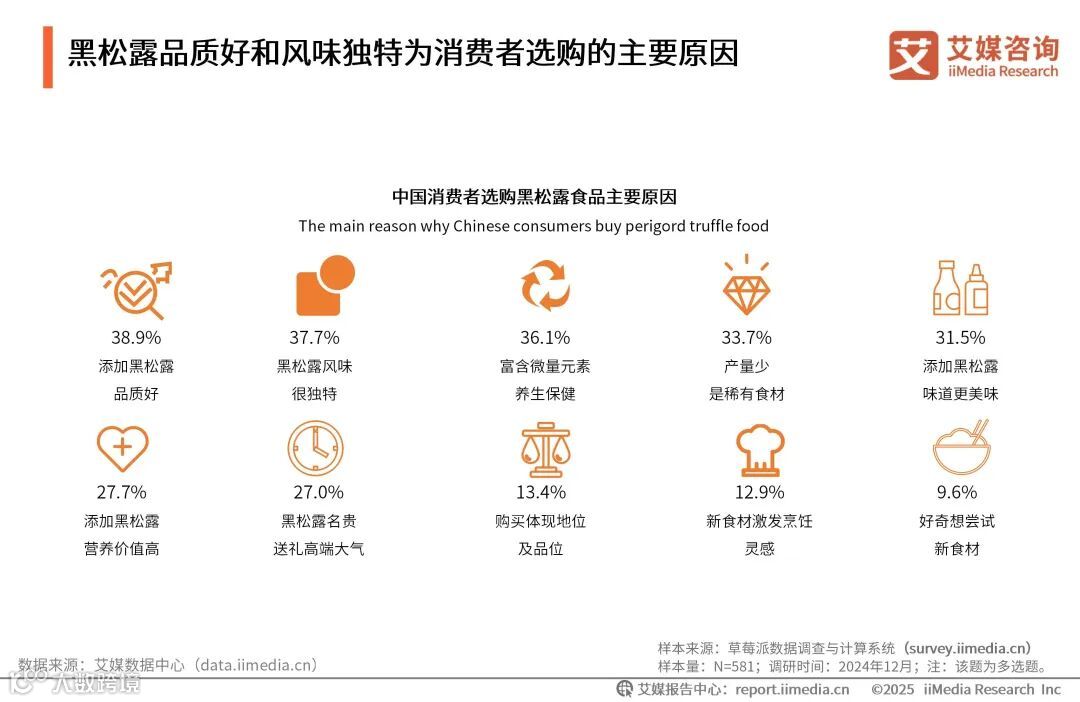 iiMedia Research(艾媒咨询)数据显示,消费者选购黑松露食品主要原因是添加黑松露品质好(38.9%)、风味独特(37.7%)及富含微量元素(36.1%);此外,黑松露的稀缺性、送礼高端等因素也是消费者购买黑松露食品的原因。艾媒咨询分析师认为,营养健康饮食仍然是多数人日常生活的一部分,如何发掘黑松露的营养价值、提高产品品质,成为黑松露食品企业提升竞争力的关键。