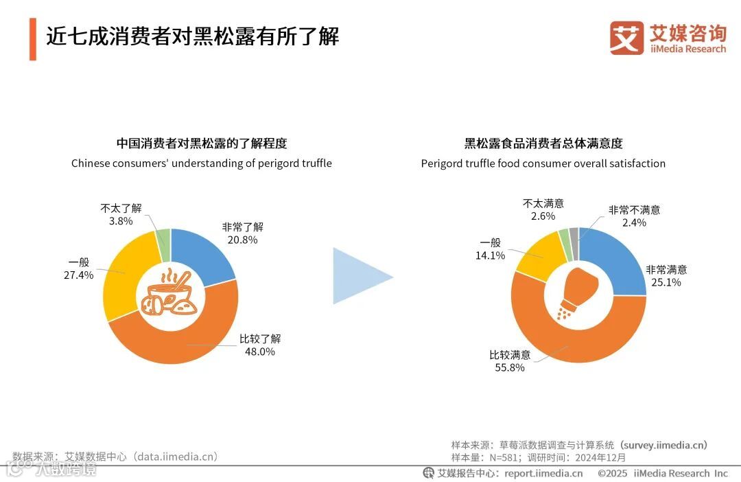 iiMedia Research(艾媒咨询)数据显示,有68.8%的消费者对黑松露的功效和主要产地有了解,多数消费者(80.9%)对黑松露食品表示满意。艾媒咨询分析师认为,随着中国消费者对于黑松露的认知度与接受度不断提升,这一食材在中国食品市场上正掀起一股“购买热潮”,预示着黑松露食品行业拥有广阔的发展前景。
