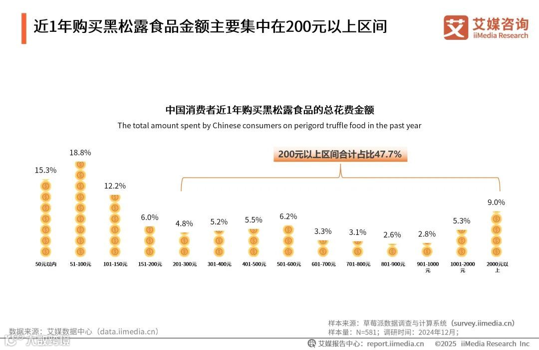 iiMedia Research(艾媒咨询)数据显示,近1年购买黑松露食品金额主要集中在200元以上区间,合计占比47.7%。按价位细分来看,51-100元较多,占比18.8%。艾媒咨询分析师认为,黑松露食品市场呈现出高端消费为主、中价位消费为辅的态势,食品企业需要依据这样的消费格局来合理规划产品与营销策略,以更好地适应市场需求、提升市场竞争力。