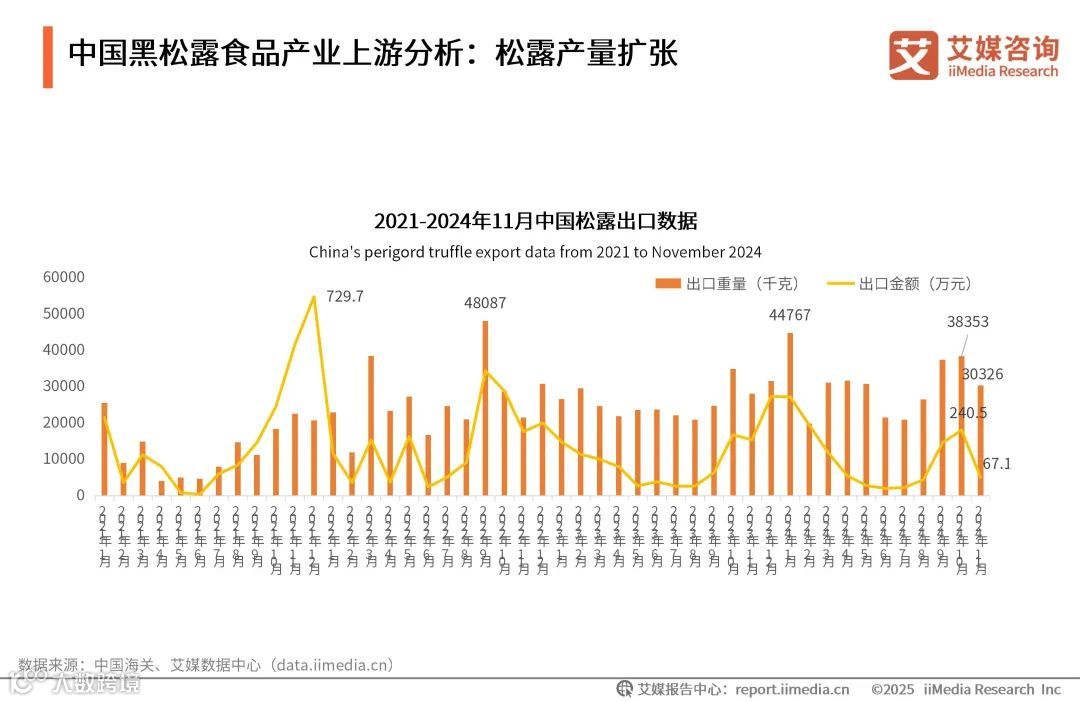 数据显示,中国的松露年产量大约在150吨左右,占全球总产量的15%,其中云南贡山县、永仁县,四川省会东县、会理及攀枝花市地区的产量占中国松露总产量的60%。据中国海关松露出口数据显示,2021年12月松露的出口金额达到了峰值,为729.7万元人民币;而到了2022年9月,其出口量则创下了最高纪录,总量超48吨。艾媒咨询分析师认为,随着黑松露培育技术的持续进步,使得黑松露产业在市场推广和产品创新等方面实现了更广泛且深入的发展,进而推动了整个产业的蓬勃兴盛。