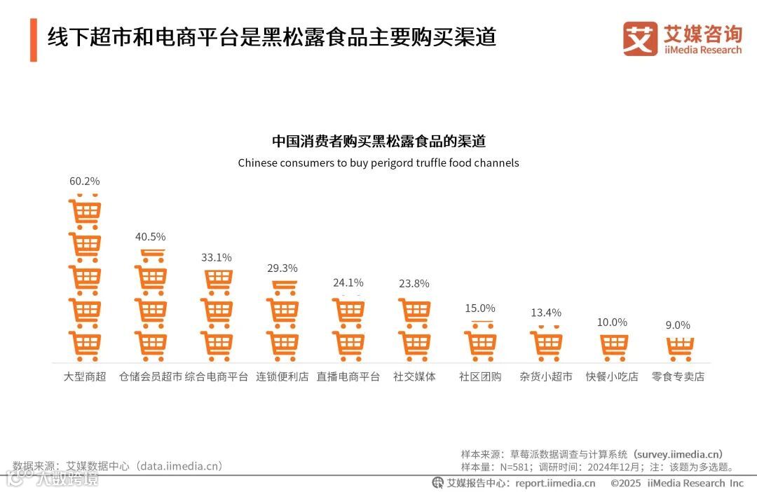 iiMedia Research(艾媒咨询)数据显示,在黑松露食品购买渠道上,线下渠道占比较大,其中大型商超占比60.2%,仓储会员超市占比达40.5%。线上渠道方面,综合电商平台占比33.1%。艾媒咨询分析师认为,黑松露食品购买渠道呈多元化,商家既要强化线上平台的便捷与服务体验,也不能忽视线下渠道的实体体验和即时满足能力,以满足不同消费群体的多元化需求。