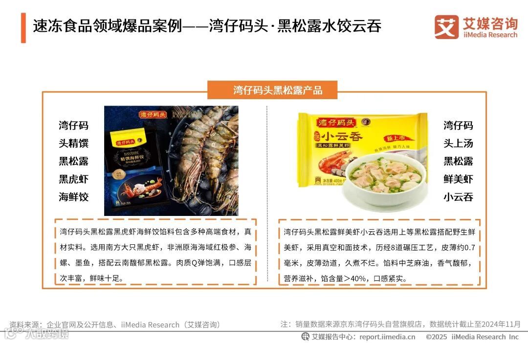 2019年,湾仔码头推出以黑松露鲜美虾水饺为代表的山珍海味系列,标志着冷食行业对黑松露风味的首次广泛关注。数据显示,截至2024年11月,黑松露黑虎虾海鲜饺在京东电商平台的销量已超过50万份,新上市的黑松露鲜美虾小云吞月销超1万,深受消费者喜爱。