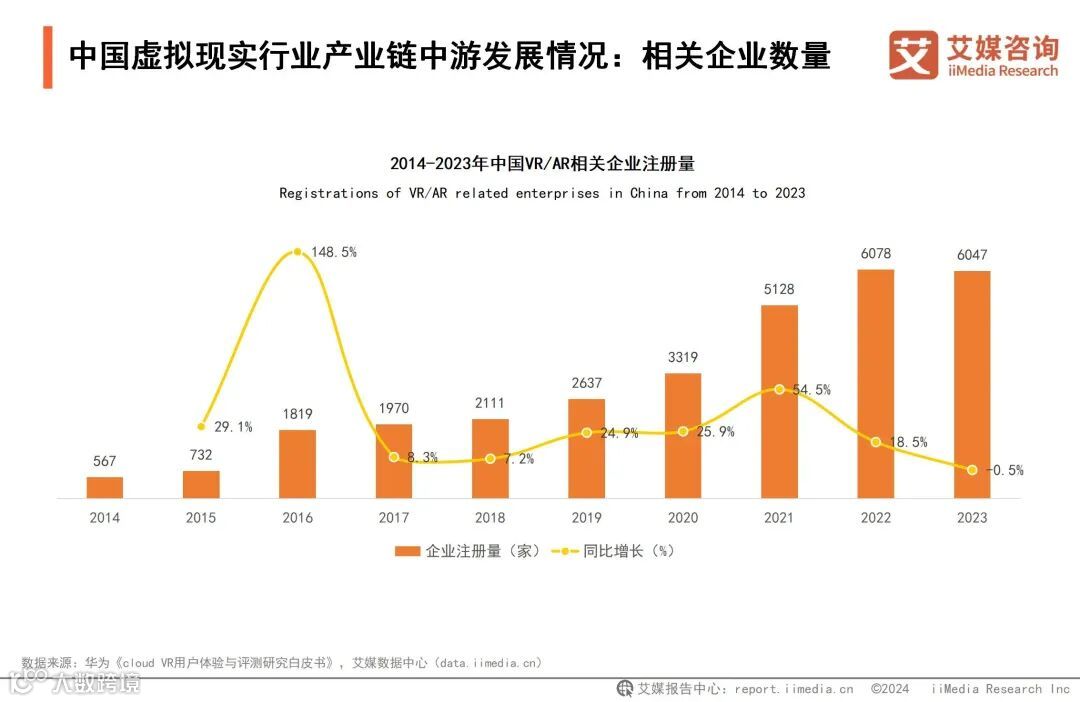 数据显示,中国现存VR/AR相关企业达2.82万家。近年来,相关企业注册量呈整体增长趋势,注册量从2014年的567家增至2023年的6047家。其中,2022年注册量达6078家,为近年来注册量峰值。