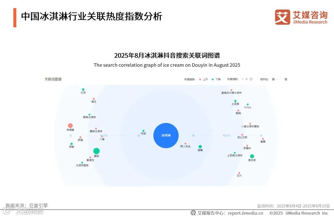 数据显示,在2025年8月抖音冰淇淋关联词图谱中,“野人先生”“草莓”“阿诺”,以及“蛋糕”“麦当劳”的相关性及热度指数较高。艾媒咨询分析师认为,关联词热度折射出冰淇淋市场分层趋势,如高端现制的野人先生、阿诺手工冰淇淋靠健康与体验引流,麦当劳等平价冰淇淋稳占刚需,而草莓口味与蛋糕形态则成为创新焦点。
