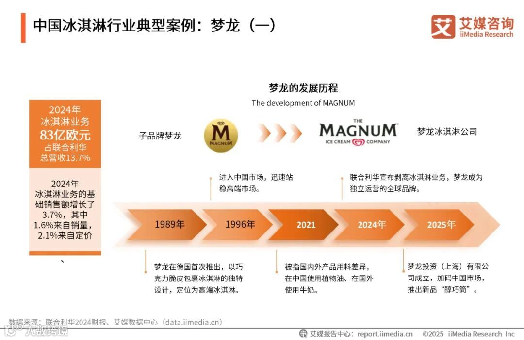 梦龙原为英国冰淇淋品牌和路雪衍生品牌,隶属联合利华旗下企业,1989年诞生于德国,1996年进入中国市场。其主打产品以比利时巧克力脆层为特色,单只雪糕的价格通常在9-10元左右,定位较为高端。2025年7月,梦龙从联合利华中脱离出来,独立运营,成立“梦龙冰淇淋公司”,并计划于2025年第四季度上市。