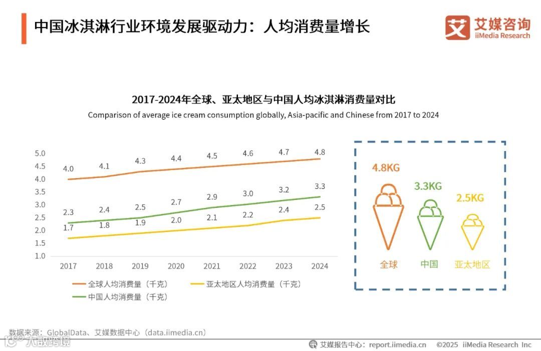 数据显示,2017年以来中国人均冰淇淋消费量逐年上涨,且始终高于亚太地区的人均消费量。2024年中国人均冰淇淋消费量达3.3千克,但是与2024年全球约4.8千克的平均水平仍有一定差距。艾媒咨询分析师认为,中国冰淇淋市场增长势头稳定,拥有较大未被激活的空间,可通过产品、功能、场景创新打开消费潜力。
