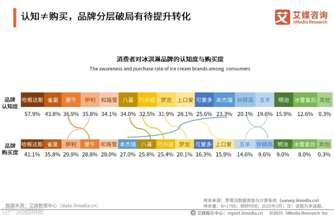 iiMedia Research(艾媒咨询)数据显示,消费者对冰淇淋品牌的认知度和购买度基本呈正相关。哈根达斯、雀巢、蒙牛等头部品牌,凭借高认知驱动高购买;腰部如八喜、巧乐兹、梦龙等虽有一定认知,但购买度低于预期。艾媒咨询分析师认为,腰部企业需要进一步挖掘认知与购买之间出现的断层,小众品牌应抓住自身特色、突破现有认知圈层。