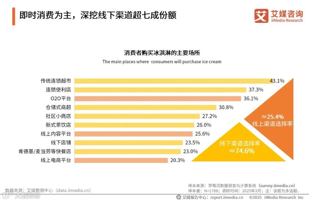 iiMedia Research(艾媒咨询)数据显示,冰淇淋销售渠道高度集中于线下,占比约74.6%,反映出即时消费属性对渠道布局的核心影响。传统连锁超市(43.1%)和连锁便利店(37.3%)的强势地位,凸显了消费者对便捷性、场景化购买的依赖。艾媒咨询分析师认为,冰淇淋企业需强化线下渠道精细运营,同时借力数字化销售渠道拓展消费场景,推动“去季节化”转型。