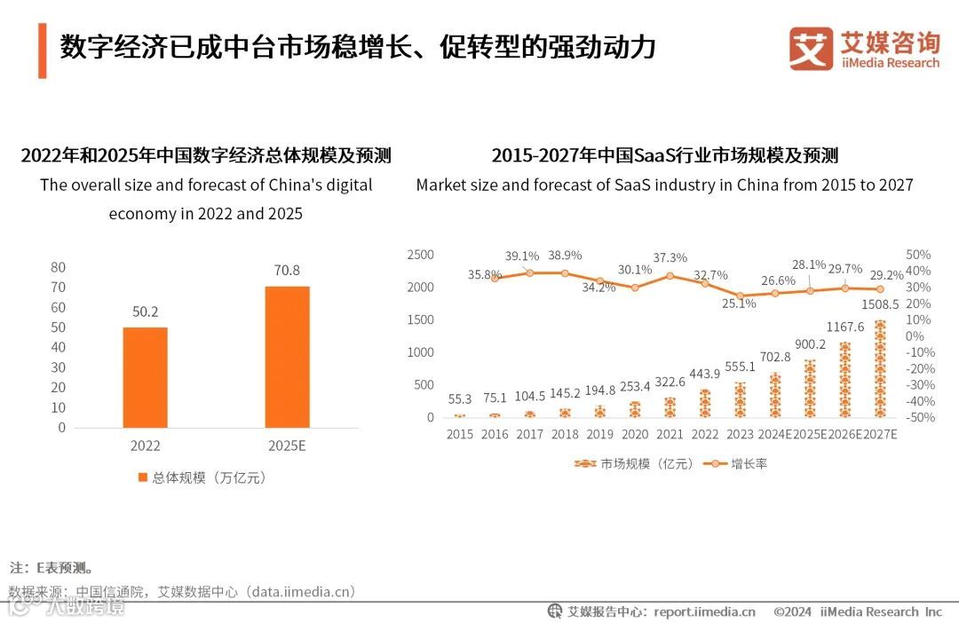 目前,传统产业数字化转型不断加快,数字经济基础设施实现跨越式进步,新业态、新模式蓬勃发展。数据显示,2022年中国数字经济总体规模达50.2万亿元,2025年有望达70.8万亿元;2015-2023年中国SaaS行业市场规模保持稳定增长,2023年达555.1亿元,同比增长25.1%,2027年有望达1508.5亿元。数字化时代中,数据安全和隐私问题成为用户和企业的关切点,企业对灵活、高效解决方案的需求持续增加,生态合作将成行业发展趋势。