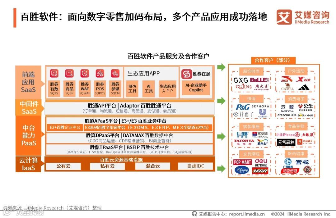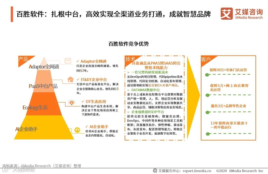 百胜软件服务客户聚焦服饰时尚、户外运动、快消、消费电子、文具潮玩、家装家居、食品生鲜、医药健康八大行业,围绕 “一云·多端·三中台”的产品战略,持续发力企业中台。百胜软件推出诸多轻型前端SaaS应用及生态产品、业务中台/数据中台/技术中台的产品,并为品牌零售企业提供混合云平台服务,满足其在前端、中台及技术上的全方位需求,助力品牌零售企业实现数智化。目前,百胜软件已为3万多家企业提供解决方案和运维服务。