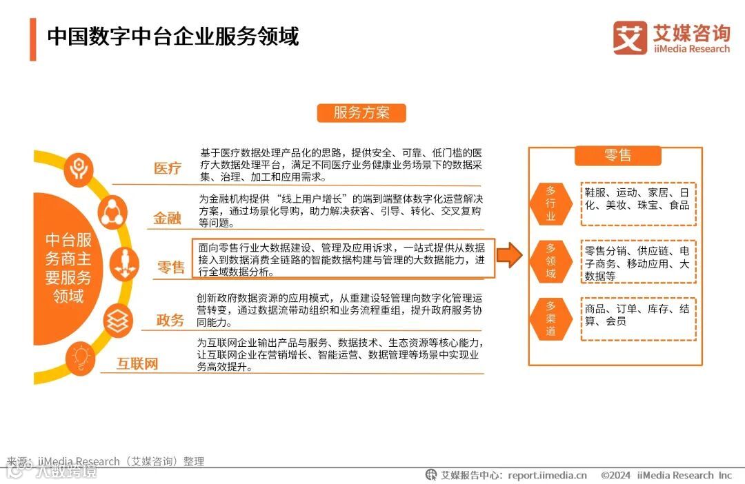 中台不仅应用在互联网及新媒体等高度数字化行业,同时也在金融、电力这样的传统行业中运行。依托技术支持,数字中台服务商为众多领域提供数字化营运方案。从行业来看,当前数字中台在金融和泛零售行业的部署程度较高,在政务、工业、医疗等行业仍有较大的发展空间。对于零售行业而言,由于移动互联网催化C端新零售模式的诞生,倒逼企业为适应新零售模式而发生内部驱动转型。零售领域涉及多行业、多渠道,急需承接前后并能促进全渠道数据流协同与分配的中台服务。