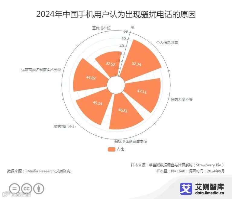 iiMedia Research(艾媒咨询)数据显示,在中国手机用户认为出现骚扰电话的原因调研中,超半数用户将其归咎于个人信息泄露。由于注册APP时需要手机号码验证(39.21%)、通讯运营商具有网安漏洞(36.02%)、含敏感信息的快递单被随意丢弃等信息泄露渠道的多样性,以及平台内部监管不严和黑客攻击等导致的非法信息交易泛滥,隐私保护问题日益严峻,导致不少用户的号码被不法分子获取。其次,47.11%的用户认为缺乏严厉的惩处措施也是难以遏制骚扰电话的重要原因。此外,受技术成本降低以及利益因素驱动,不少骚扰电话商家不惜铤而走险,踏上了利用电话进行非法牟利的“圈钱”歧途。