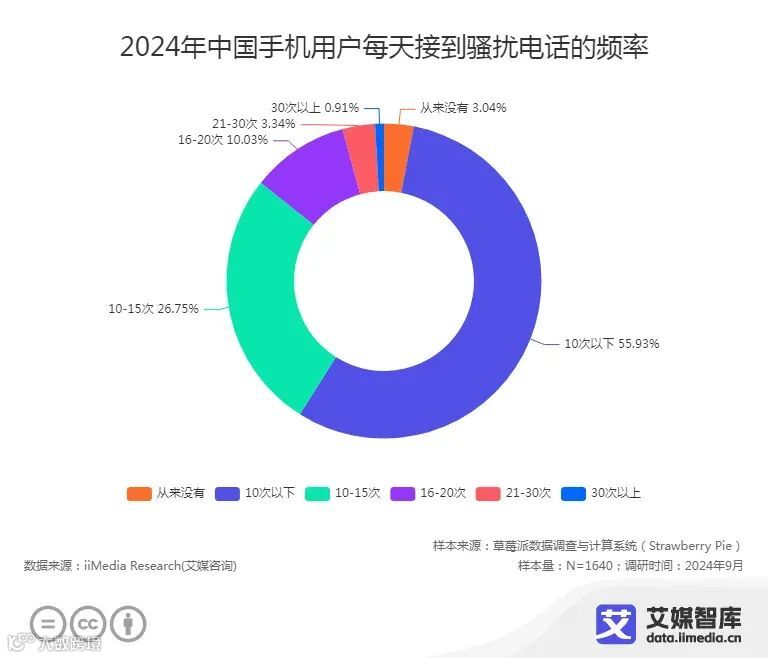 手机用户受骚扰电话侵扰较普遍,且频率较高。iiMedia Research(艾媒咨询)数据显示,在中国手机用户每天接到骚扰电话的频率调研中,55.93%用户日接骚扰电话10次以下,约三分之一用户面临更频繁骚扰,26.75%用户达10-15次,10.03%用户达16-20次。骚扰电话已成为用户日常生活的沉重负担,影响生活品质与工作效率。