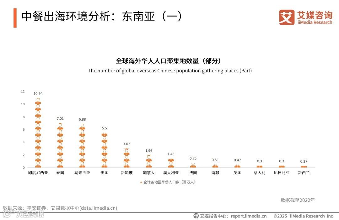 数据显示,在全球海外华人人口聚集地中,东南亚的华人数量规模较多,包括印度尼西亚、泰国和马来西亚等。艾媒咨询分析师认为,东南亚是海外华人集中分布的地区,海外华人对中餐有深厚的情感认同和饮食习惯,为中餐品牌出海提供了稳定的初始消费群体和文化基础。他们在促进中餐文化传播和减少文化隔阂方面发挥着重要的作用,助力中餐品牌更好地融入当地市场。